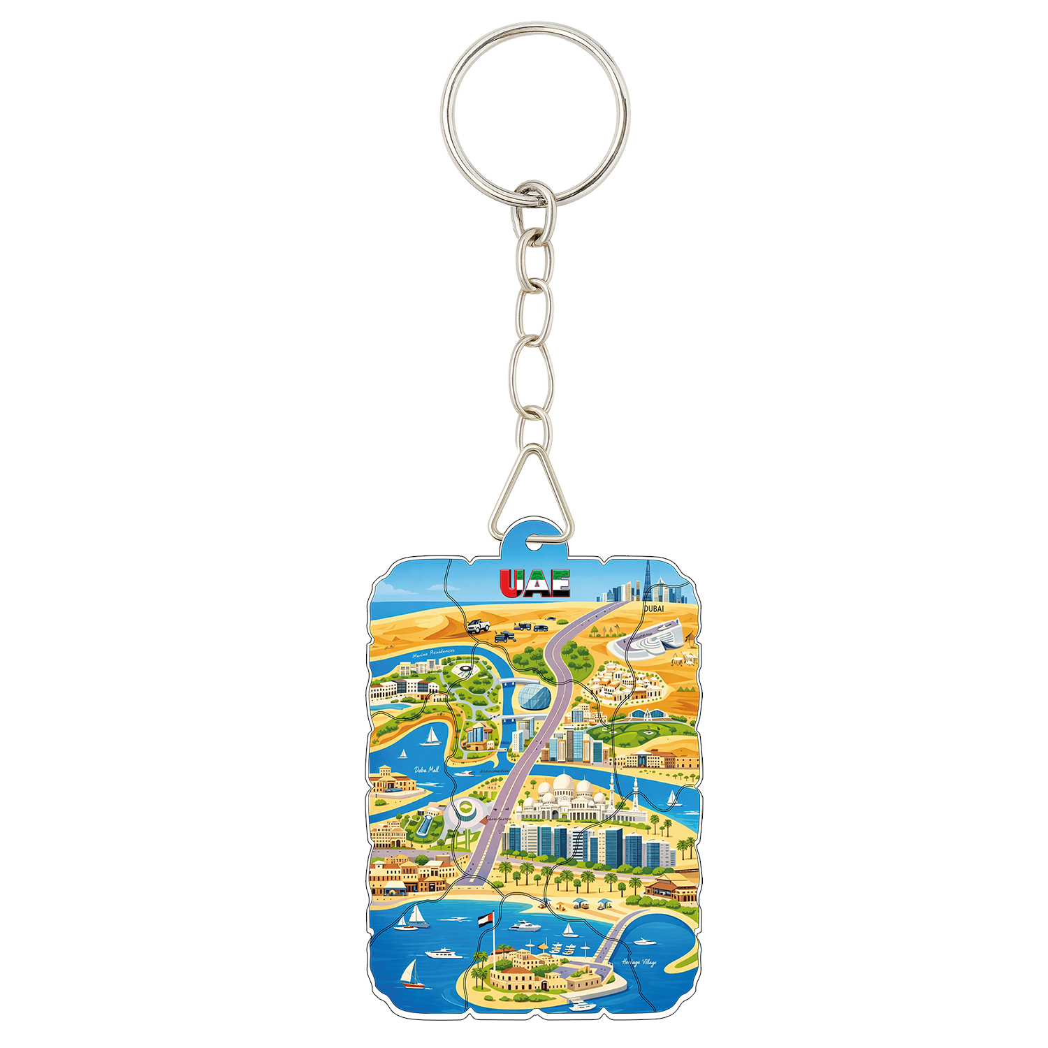 Dayanıklı plastik malzemeden üretilmiş anahtarlık, her iki yüzüne uygulanan yüksek çözünürlüklü renkli baskısıyla uzun süre kalıcı bir görünüm sunar. Metal anahtarlık halkası sağlam, güvenilir ve günlük kullanıma uygundur.